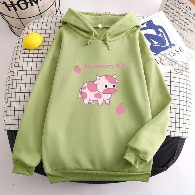 Let’s add something new and cute to your wardrobe with this adorable Kawaii Strawberry Cow Womens Oversized Hoodie or give it as the perfect gift!